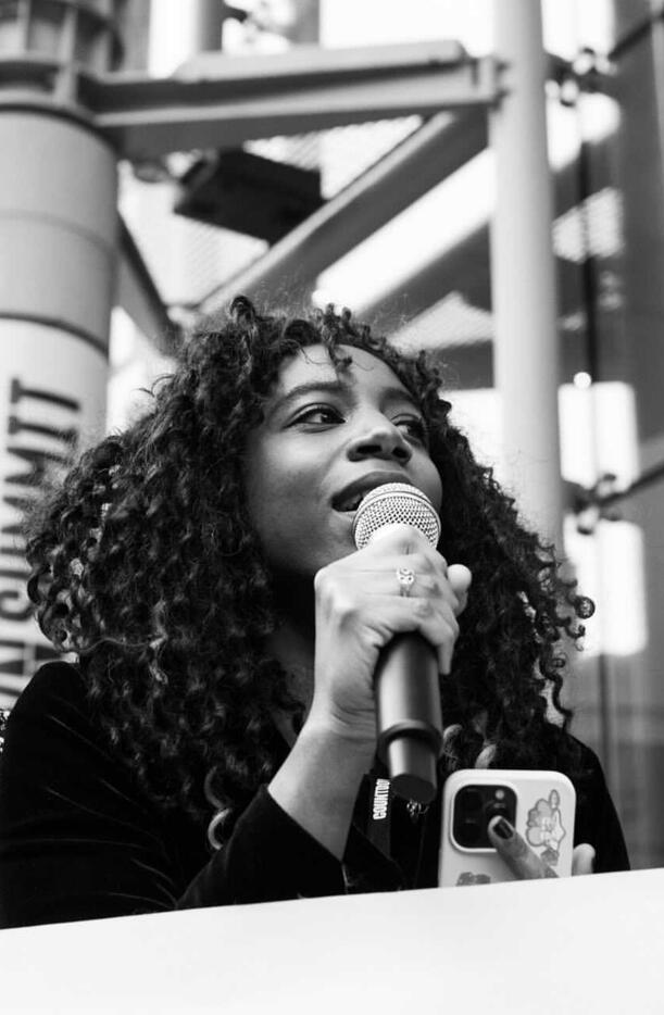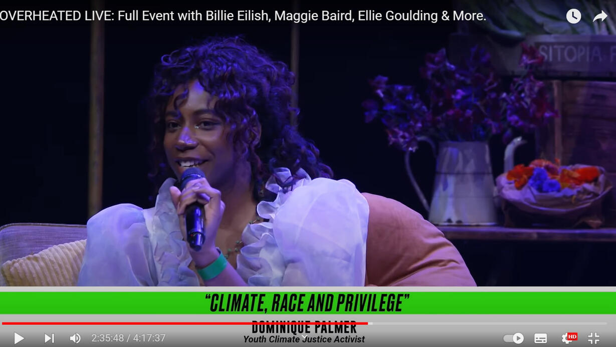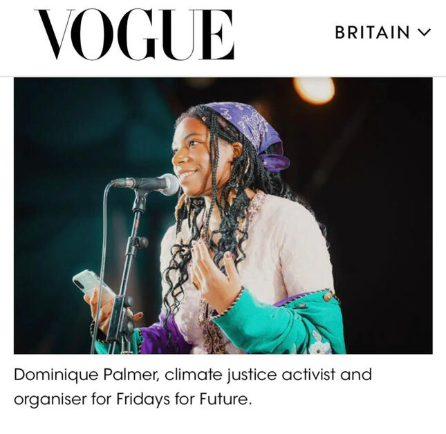 activists on Sky News, and appears in New York Times, Huffington Post, BBC Three, National Geographic, Guardian Weekend, Washington Post, Bustle, PopSugar, Global Citizen, Healthline, and more .She is an engaging and powerful speaker, and has spoken on world stages about Climate Justice, her activism, and inspiring hope and action at events such as UN Climate Change Conference COP26, the mainstage of Sziget festival to thousands of attendees, the Southbank Centre to over 2,500 the New York Times Hub, Southbank Centre with an audience of 2,700, the UN Women CWS66 Youth Forum,at COP25 with the Indigenous Pavillion, Leeds International Festival of Ideas,and TEDxCountdown with Climate Reality. She has spoken alongside changemakers and figures such as Emma Watson, Malala, Billie Eilish, Greta Thunberg, Mary Robinson, Naomi Klein, Simon Kofe, Vanessa Nakate, and more.Harnessing the creative arts to communicate the climate, and finding joy is a focus of hers. She has hosted a panel at Overheated with Billie Eilish at the O2, held an event at the Southbank Centre titled ‘Climate Joy and Optimism,’ recorded a song for earth day with Swedish grammi winning artist Titiyo, delivered a worksop with Live Out for the Grammy Museum, and presented the influential power of the arts for climate action at the Barbican.She was a co-author and performer for ‘Rewilding Dream’ a magical story of resorting nature, refugee children who walk this world seeking a safe place to call home, and protecting our planet, which she did live readings in theatres across the U.K with the Southbank Centre.Palmer is also passionate about sustainable fashion, and veganism. She has walked Kornit fashion week show with Anyango Mpinga, featured in the Sunday Times for sustainable brand 'Mother of Pearl', and has modeled for brands environmental campaigns including PANGAIA family campaign, and Kurt Geiger ‘People Empowered.’She was part of the UN Women’s Feminist Action Coalition for Climate Justice with Fridays for Future MAPA , and a contributor in the co-development of the Global Youth Recommendations: Youth, Gender, and Climate Change.She pushes for equitable climate action, and pressures leaders to act. She is an Arctic Angel for Global Choices and a Treaty Champion for the Fossil Fuel Non-Proliferation Treaty. Additionally, she is a Contributing Climate Justice editor with @feminist on Instagram and author for Shado Mag.Dominique has also consulted funders, brands and companies on engaging Gen Z, and sustainability, as well as delivered workshops on topics ranging from Eco-Anxiety, to sustainable practices. She has judged for awards such as Photo VOGUE, and the Country & Townhouse Brand Awards. She has worked with brands including Lush, Sky Tv Nature, and Rainforest Alliance.She is now a recent graduate student of the University of Birmingham studying Political Science and International Relations, and wrote her dissertation on the intersection of climate change and gender, with a focus on how interconnected identities shape experiences of Climate Justice.