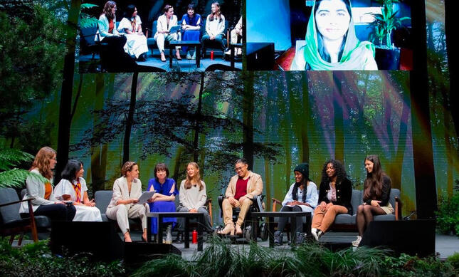 Dominique on stage at the NY Times Hub at COP26, in conversation hosted by Emma Watson, joined by Malala, Greta Thunberg, Tori Tsui, Daphne Frias, Ati Viviam and Mya Rose Craig